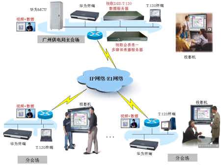 如上圖所示,廣州供電局視頻會議系統基于IP/E1雙網絡,MCU采用華為Viewpoint8620綜合視訊交換平臺,終端采用華為ViewPoint