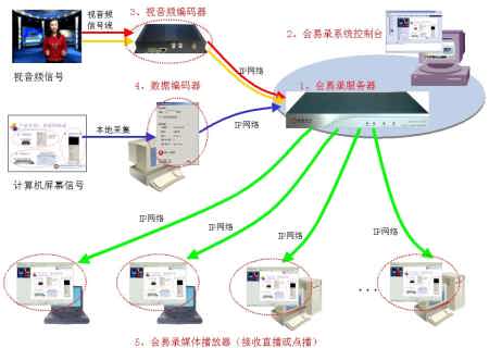 如上圖所示,會易錄通過視音頻編碼器和數據編碼器分別采集視音頻信號和計算機屏幕信號,編碼后通過網絡發(fā)送到會易錄服務器,會易錄服務器可將收到的視音頻信號和計算機屏幕信號進行同步一體化的錄制、直播、點播。系統的管理控制通過會易錄系統控制臺實現。