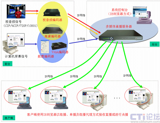 可通過(guò)單播或組播方式將會(huì)議現(xiàn)場(chǎng)的視頻、音頻、計(jì)算機(jī)動(dòng)態(tài)屏幕在網(wǎng)絡(luò)上進(jìn)行實(shí)時(shí)直播,用戶可通過(guò)IE瀏覽器登錄服務(wù)器實(shí)時(shí)接收直播的視頻、音頻和計(jì)算機(jī)動(dòng)態(tài)屏幕內(nèi)容。系統(tǒng)獨(dú)家支持組播代理功能,無(wú)須更改網(wǎng)絡(luò)設(shè)備的設(shè)置即可實(shí)現(xiàn)跨網(wǎng)段的組播。系統(tǒng)獨(dú)家支持文件組播功能,可將錄制好的文件在網(wǎng)絡(luò)上再次進(jìn)行組播。