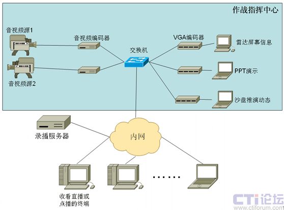 在軍隊(duì)系統(tǒng)中比較典型的應(yīng)用是軍隊(duì)作戰(zhàn)演習(xí)的錄播。軍隊(duì)中常會(huì)進(jìn)行軍事演習(xí)、網(wǎng)上模擬對(duì)抗訓(xùn)練,以此來(lái)增強(qiáng)現(xiàn)代化軍隊(duì)的作戰(zhàn)能力,演習(xí)指揮部在作戰(zhàn)指揮中心通過(guò)大屏等顯示設(shè)備全盤(pán)了解對(duì)抗雙方動(dòng)態(tài),以往缺乏有效的演習(xí)記錄手段,不利于事后分析及總結(jié)經(jīng)驗(yàn)教訓(xùn)。會(huì)易錄支持多路AV和VGA信號(hào)的同步組合錄制,可以把演習(xí)過(guò)程中作戰(zhàn)指揮中心顯示的信息進(jìn)行全面的錄制,如對(duì)抗雙方的視音頻信息、網(wǎng)上沙盤(pán)推演動(dòng)態(tài),雷達(dá)屏幕信息等內(nèi)容,同時(shí)也可以通過(guò)網(wǎng)絡(luò)將上述信息實(shí)時(shí)傳送給上級(jí)部門(mén)來(lái)進(jìn)行網(wǎng)上演習(xí)的在線觀摩。該錄播系統(tǒng)的典型框圖如下: