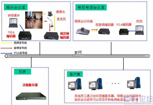 由于視頻會議系統(tǒng)沒有覆蓋公司內(nèi)所有的會議室,因此這些會議室召開的會議就無法進(jìn)行直播,而借助于多媒體錄播系統(tǒng)就可以很好的解決這一缺陷。通常將這些會議室中的攝像頭和麥克風(fēng)接入到視音頻編碼器上,將講師電腦上的培訓(xùn)課件(如PPT,Word等文檔)內(nèi)容接入到VGA編碼器上,兩者將采集到的信號通過網(wǎng)絡(luò)發(fā)給錄播服務(wù)器,由錄播服務(wù)器進(jìn)行處理后直播到各個客戶端,就可以很方面的對于任意一個會議室召開的會議進(jìn)行錄播,隨時隨地對員工傳達(dá)會議精神。