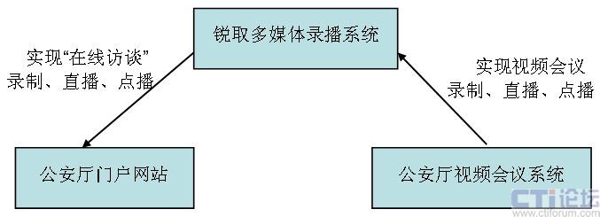 如圖所示,銳取多媒體錄播系統(tǒng)前端的視音頻編碼器采集視頻會議系統(tǒng)攝像機拍攝的公安機關領導或?qū)<以诰交流的視頻圖像和交流現(xiàn)場的聲音,將采集的視頻和音頻信號通過網(wǎng)絡傳輸?shù)胶笈_的多媒體錄播服務器中。服務器的錄制模塊將從視音頻編碼器接收到的信號進行同步組合錄制,錄制的文件存儲在服務器的硬盤上。服務器的點播模塊調(diào)用硬盤中已錄制的文件實現(xiàn)點播功能。服務器的直播模塊將從視音頻編碼器接收到的信號分發(fā)到網(wǎng)絡上,需要觀看“在線訪談”直播視頻的網(wǎng)民只需登錄省公安廳政府門戶網(wǎng)站,安裝專用客戶端軟件就能接收到公安機關領導或?qū)<以诰交流的實時內(nèi)容。通過客戶端軟件的在線交流功能,觀看直播的網(wǎng)民還可以向公安機關領導或?qū)<姨釂,真正實現(xiàn)了“在線訪談”貼近群眾、服務群眾的目標。