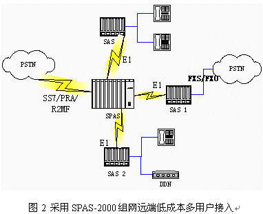 SPAS可編程交換機(jī)通過(guò)E1可以支持多個(gè)遠(yuǎn)端模塊。遠(yuǎn)端模塊采用SPAS-SAS框,可以帶多種用戶接口:普通模擬用戶、DDN、環(huán)路中繼用戶;通過(guò) SPAS主模塊對(duì)外提供各種信令接入。適合多點(diǎn)接入組網(wǎng),且組網(wǎng)成本低。組網(wǎng)圖見(jiàn)圖2: