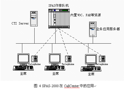 目前國(guó)內(nèi)呼叫中心的建設(shè)方興未艾,企業(yè)為了改善服務(wù),贏得客戶,紛紛建設(shè)自身的呼叫中心。如果建立呼叫中心全部采用國(guó)外設(shè)備,價(jià)格非常昂貴,使很多客戶望而卻步。這樣大的投資目前也只有電信(包括移動(dòng)和聯(lián)通)、電力、銀行等資金充裕的行業(yè)才能承受。而且,根據(jù)我方了解,即使這些行業(yè)也在控制采購(gòu)成本,原先只注重名牌,不計(jì)成本的情況正在改變。而在目前宏觀經(jīng)濟(jì)形勢(shì)不景氣的大背景下,大中型企業(yè)既要加快企業(yè)信息化建設(shè),保住客戶,降低成本,又要精打細(xì)算,規(guī)避投資風(fēng)險(xiǎn)。我們掌握建立呼叫中心設(shè)備的所有核心技術(shù),因此在呼叫中心應(yīng)用方面有很大的價(jià)格優(yōu)勢(shì),這樣就降低了擁有呼叫中心的門檻,在這個(gè)市場(chǎng)上也有很強(qiáng)的競(jìng)爭(zhēng)力。采用SPAS-2000可編程交換機(jī)支持智能業(yè)務(wù)通用編程接口,可以作為CallCenter核心設(shè)備,應(yīng)用圖見(jiàn)圖4: