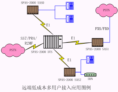tyutSPAS-2000可編程交換機通過E1可以支持多個遠端模塊。遠端模塊采用SPAS-2000 SAS框,可以帶多種用戶接口:普通模擬用戶、DDN、環(huán)路中繼用戶;通過SPAS-2000 DTS對外提供各種信令接入。適合多點接入組網(wǎng),組網(wǎng)成本低廉。 在示意圖中,SAS表示遠端用戶接入框,它可以通過需要選擇接入模擬用戶:FXO/FXS、E/M、普通模擬用戶和DDN。中心為SPAS可編程交換機,可以通過 SS7/PRA/R2MF進行匯接轉換。