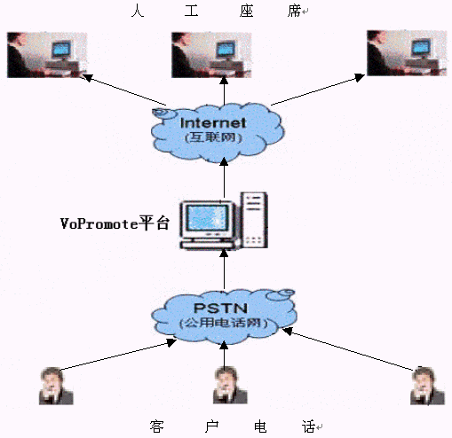 傳統(tǒng)方式為呼叫方撥通電話后直接進入電信網絡以模擬信號的傳播與被叫方通話。VoPromote語音平臺的VOIP解決方案為:外呼電話接入VoPromote語音平臺,通過VoPromote語音平臺的解析后模擬信號轉換為數字信號以Internet網為媒介進行語音數據的傳輸。接收方只需在接入Internet網的計算機上安裝聲卡即可通過主機的聲音輸入/出接口來實現(xiàn)與對方的通話。從而利用網互聯(lián)網打一通"免費電話"。
