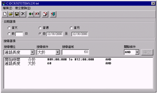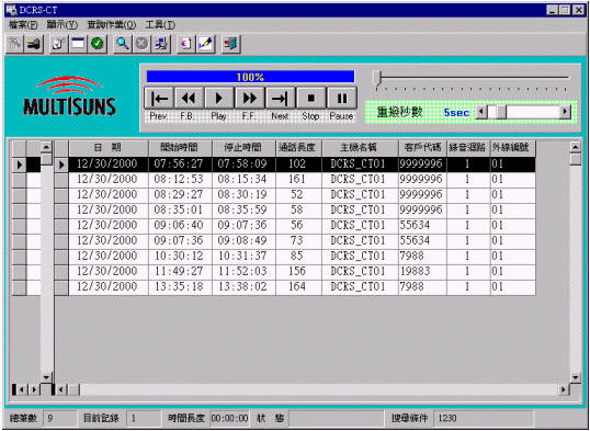 在錄音設(shè)備與用戶之程控交換機(PBX)整合條件下,DCRS CT Integra允許用戶以中繼線號碼、分機號碼、開始通話時間、通話長度、撥入電話、撥出電話、服務(wù)人員代碼、服務(wù)人員姓名、服務(wù)人員部門別、撥入群組代碼 (ACD Group ID)、撥號字符串、來話號碼(Caller ID)等等為收尋錄音資料條件。再依您需要找尋條件,重建單位內(nèi)部人員與外部人員雙方通話內(nèi)容就輕而易舉。舉例說,您可以在一瞬間就查詢到您所聘雇之客服員張小姐于過去一星期中接到某某公司李先生多少通電話,李先生是什幺時候打來的,張小姐每一通電話花多少時間去服務(wù)李先生,其講話的內(nèi)容又是什幺。