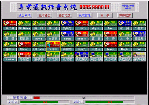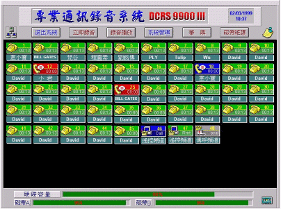 DCRS與BRS系列之全數(shù)字專業(yè)通訊簿音系統(tǒng),彩色動畫窗口,配合鼠標(biāo)操作,使您一目了然,操作容易。您可由主窗口圖標(biāo)中,清楚知道每一回路目前錄音狀態(tài),例如呈綠色的圖標(biāo)是顯示回路是閑置狀態(tài)(沒有通話狀態(tài)),用不同顏色加上不同圖案,是最易懂、最一目了然表現(xiàn)方式。各種操作按鍵與儲存裝置(Storage Media)狀態(tài)也出現(xiàn)在很醒目位置上也是另一系統(tǒng)特色。下面文章對回路各種常見圖標(biāo)有進一步說明。