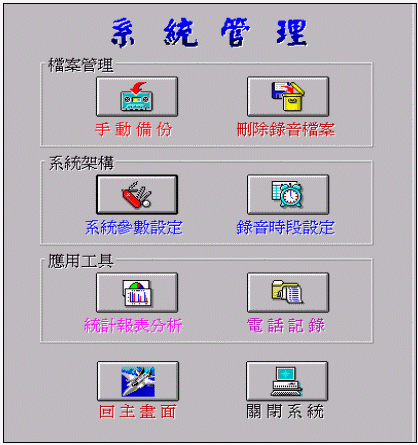 三個方塊區(qū):檔案管理區(qū)、系統(tǒng)架構(gòu)區(qū)和應(yīng)用工具區(qū)。各方塊區(qū)內(nèi)有其包含之功能指令。此外,"回主畫面"的功能鍵提供您可回到主窗口畫面的功能;"關(guān)閉系統(tǒng)"功能鍵則提供您正常操作關(guān)掉此錄音系統(tǒng)的功能。您不須依賴操作手冊,也不需要別人指導(dǎo),您就可以執(zhí)行一些系統(tǒng)維護設(shè)定功能。