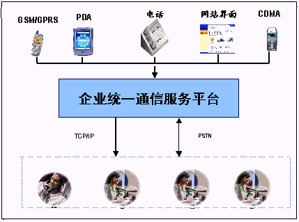 企業(yè)統(tǒng)一通信平臺(tái)提供了多種接入方式:人工坐席接入、自動(dòng)語(yǔ)音IVR、GPRS、WAP接入、寬帶接入、短信息接入;同時(shí)還提供了多種信息發(fā)布方式: