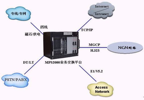 - MPS2000具有多接口的支持能力。系統(tǒng)除了能支持?jǐn)?shù)字中繼以外還能夠支持環(huán)路中繼、E/M接口、磁石接口、共電接口等專網(wǎng)中常用的接口,以及IP接口,以便與IP語音網(wǎng)對接。