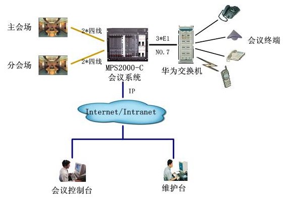 該會(huì)議系統(tǒng)通過(guò)3個(gè)數(shù)字中繼,與華為用戶交換機(jī)互連,通信采用NO.7信令。4路4線中2路接主會(huì)場(chǎng)調(diào)音臺(tái),2路分會(huì)場(chǎng)調(diào)音臺(tái),實(shí)現(xiàn)會(huì)議室擴(kuò)音設(shè)備的接入。通過(guò)以太網(wǎng)口與D-LINK網(wǎng)絡(luò)交換機(jī)互連,接入廊坊電力的局域網(wǎng),實(shí)現(xiàn)維護(hù)管理及會(huì)議控制等功能。