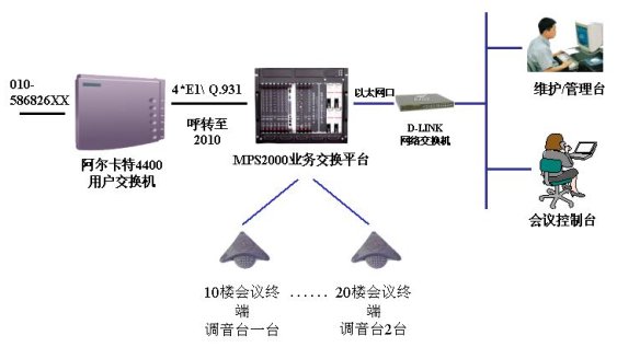 該會議系統(tǒng)通過4個數(shù)字中繼,與國電原有的阿爾卡特4400用戶交換機互連,通信采用Q.931信令。4路4線實現(xiàn)會議終端的接入,現(xiàn)使用3路,1路接國電10樓的調(diào)音臺,2路接20樓的調(diào)音臺,實現(xiàn)會議室擴音設備的接入。通過以太網(wǎng)口與D-LINK網(wǎng)絡交換機互連,接入國電集團的局域網(wǎng),實現(xiàn)維護管理及會議控制等功能。國電集團的會議接入號為:010-586826XX,因原有交換機的功能局限,以該接入號到交換機后自動呼轉(zhuǎn)到2010進入MPS2000會議系統(tǒng),實現(xiàn)會議的呼入。