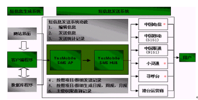 ·由YesMobile提供Api程序包,用戶按照技術(shù)規(guī)范開發(fā)Web或客戶端程序完成接入,通過YesMobile的短信平臺向用戶指定客戶發(fā)送信息;