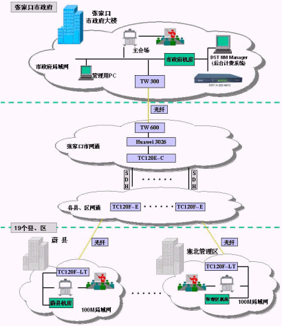 張家口市地處河北省與內(nèi)蒙古交界處,地域廣闊,如何實(shí)現(xiàn)方便、及時(shí)、快捷的溝通一直困擾著市政府。其下設(shè)的19個(gè)區(qū)縣的線路質(zhì)量參差不齊,整個(gè)網(wǎng)絡(luò)環(huán)境非常復(fù)雜。經(jīng)過(guò)一系列的商討,張家口政府成為了聯(lián)通公司第一位簽約用戶。