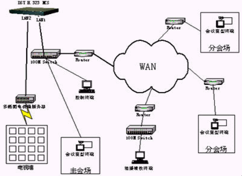 多點控制器采用鼎視通公司的DST H.323 MCS多點控制單元。DST H.323 MCS是鼎視通公司最新研制開發(fā)的高性能媒體交換設(shè)備,提供在分組交換網(wǎng)絡(luò)平臺之上的多種媒體交換服務(wù)。其面向的用戶既可以是企業(yè)、機(jī)關(guān)、學(xué)校等中小規(guī)模用戶,也可以是網(wǎng)絡(luò)運(yùn)營商、業(yè)務(wù)提供商等大型用戶。并且它是唯一一款支持電視墻輸出的多點控制單元,同時結(jié)合鼎視通公司的多畫面電視墻服務(wù)器實現(xiàn)主會場電視墻的輸出。