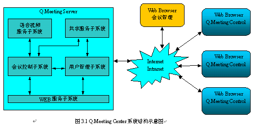 由于采用基于WEB的客戶端,Q.Meeting Center的部署是比較簡(jiǎn)單的。只需按Q.Meeting Server的運(yùn)行環(huán)境要求安裝配置好會(huì)議服務(wù)器即可。主持人和其他與會(huì)者使用普通PC機(jī)通過WEB瀏覽器訪問會(huì)議URL地址即可參加會(huì)議。