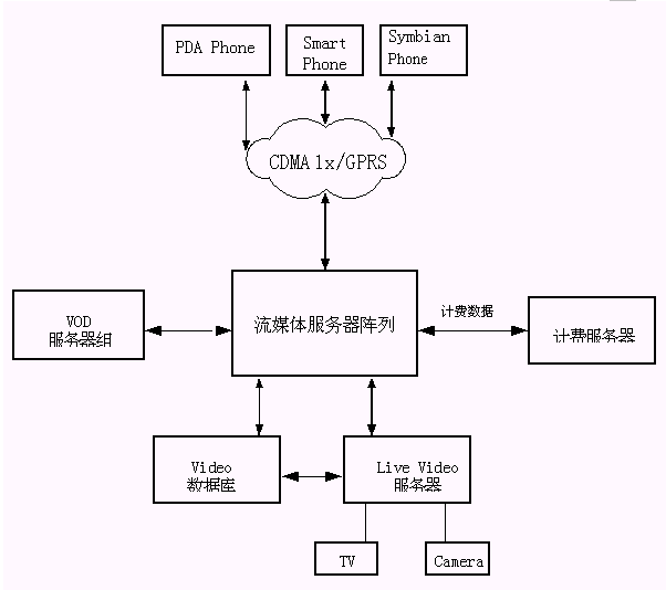 根據(jù)中國2.5網(wǎng)絡的特點,結合我們自身的技術和系統(tǒng)解決方案的優(yōu)勢,我們針對CDMA1X網(wǎng)絡推出了移動VOD,增強型移動視頻郵件、移動可視電話的系統(tǒng)解決方案。在GPRS網(wǎng)絡上則推出了移動音頻點播業(yè)務,移動視頻郵件業(yè)務。下面我們對這些業(yè)務做具體描述。