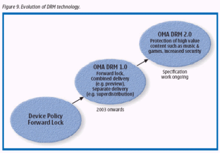圖9簡(jiǎn)要概述了DRM技術(shù)的發(fā)展經(jīng)過。迄今為止,市場(chǎng)已經(jīng)為保護(hù)內(nèi)容提供了各種各樣的版權(quán)解決方案。其中一種值得提及的解決方案是"device policy