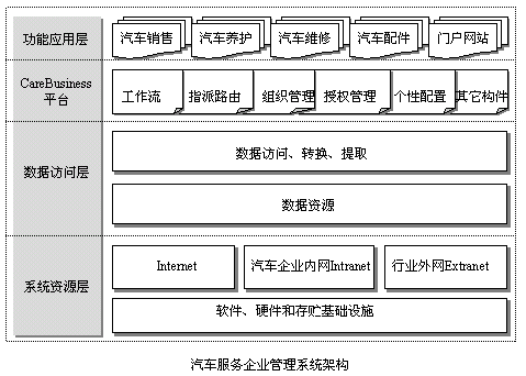 CareBusiness Suite主要包含了汽車銷售管理系統(tǒng)、汽車養(yǎng)護(hù)管理系統(tǒng)、汽車維修管理系統(tǒng)和汽車配件管理系統(tǒng)等系統(tǒng)模塊,這些系統(tǒng)及其系列模塊統(tǒng)一構(gòu)建于CareBusiness