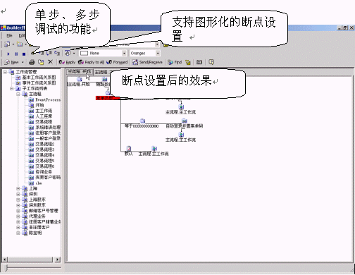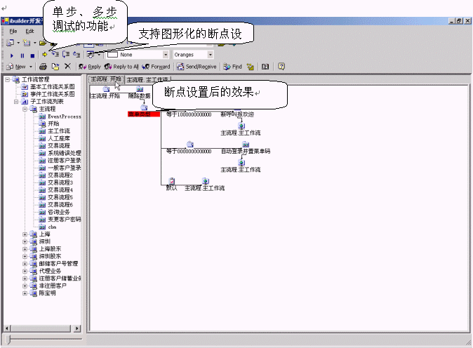 ·支持圖形化的斷點(diǎn)設(shè)置,單步、多步調(diào)試的功能。在需要設(shè)置斷點(diǎn)限制的地方,選擇該節(jié)點(diǎn),鼠標(biāo)點(diǎn)擊斷點(diǎn)調(diào)試功能按鍵,則任何經(jīng)過該節(jié)點(diǎn)的流程都會(huì)在該節(jié)點(diǎn)暫停,等待開發(fā)者察看或者修改輸入輸出變量、腳本。點(diǎn)擊執(zhí)行下一步,則流程會(huì)經(jīng)過該節(jié)點(diǎn),在下個(gè)節(jié)點(diǎn)暫停,如果開發(fā)者不想單步執(zhí)行,可以點(diǎn)擊執(zhí)行按鈕,則流程立刻執(zhí)行不會(huì)停住。如圖3.2所示。