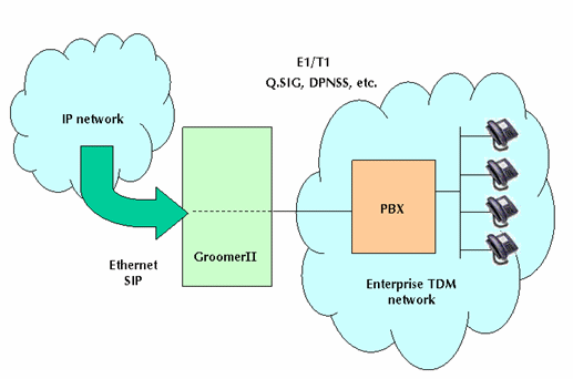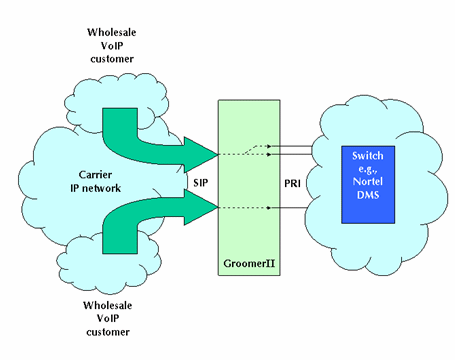 圖1中的GroomerII支持PRI協議,如:NI-2、ETS300和INS1500等,可以實現網關的功能把運營商自己的電路交換網和IP網絡相互連接在一起。這種設置允許網絡運營商向其他業(yè)務供應商提供批量VoIP業(yè)務。這類業(yè)務運營商據此可以向他們的客戶提供具有區(qū)分性的業(yè)務,如:利用SIP電話呼叫等。
