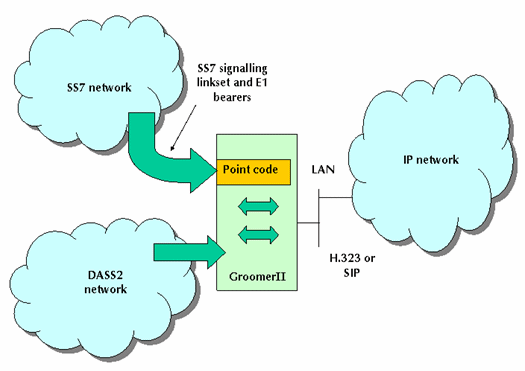 如上所述,GrommerII可以安裝不同的協議軟件。圖2中的系統(tǒng)配備了SS7和DASS2的GrommerII,擔當與IP網絡相連的網關,完成IP呼叫。