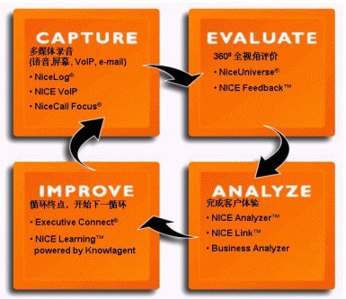 NICE System公司率先提出了CEM-客戶體驗(yàn)管理-的新觀念,是客戶體驗(yàn)管理的先驅(qū)者,它將此觀念融入在NICE錄音網(wǎng)控系統(tǒng)中,與ACD、CTI及CRM等客服中心既有的投資設(shè)備整合為一體,便可達(dá)到隨時(shí)掌握客戶與客服中心間的互動(dòng)經(jīng)驗(yàn),以期能夠隨時(shí)調(diào)整客服中心的經(jīng)營(yíng)方向與策略,提升客戶的滿意度,并改善坐席人員的服務(wù)效率與品質(zhì)等。 在NICE CEM的概念中,主要是以四個(gè)作業(yè)循環(huán)達(dá)成改善的目標(biāo),包括記錄(Capture)、評(píng)估(Evaluate)、分析(Analyze)、改善(Improve)等。