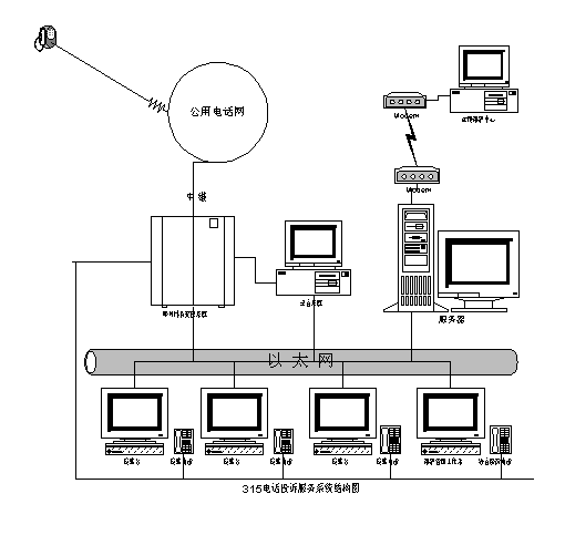 | ZQ-315電話投訴服務(wù)系統(tǒng)由如下各部分組成: 4呼叫排隊交換系統(tǒng) 4座席臺 4數(shù)據(jù)庫服務(wù)器 4系統(tǒng)維護管理臺 4同步數(shù)字錄音系統(tǒng) 4遠(yuǎn)程通訊模塊 4遠(yuǎn)程維護終端 各部分通過集線器和五類雙絞線組成快速以太網(wǎng);各節(jié)點之間采用TCPAP協(xié)議,以 Socket方式進行通訊。其組成結(jié)構(gòu)如下圖所示。 ![]() 1.呼叫排隊交換系統(tǒng) 4與公用電話網(wǎng)相連,將來話分配到座席臺或遇忙排隊 4自動應(yīng)答來話,完成自動受理投訴與自動查詢服務(wù) 4進行呼叫轉(zhuǎn)移 2.座席臺 4人工應(yīng)答來話 4顯示主叫號碼、戶主與地址等信息(根據(jù)需要) 4計算機輔助投訴受理 4計算機輔助業(yè)務(wù)咨詢(法律。個案等) 3.?dāng)?shù)據(jù)庫服務(wù)器 4運行網(wǎng)絡(luò)操作系統(tǒng) 4運行數(shù)據(jù)庫系統(tǒng) 4提供各種數(shù)據(jù)服務(wù) 4對網(wǎng)絡(luò)安全性進行檢查控制 4.系統(tǒng)維護管理臺 4對數(shù)據(jù)庫進行維護管理 4查詢各種業(yè)務(wù)數(shù)據(jù),生成統(tǒng)計報表。 5.同步數(shù)字錄音系統(tǒng) 4將模擬話音轉(zhuǎn)換成數(shù)字信號,并壓縮存儲。多路錄音,互不干擾 4支持多種語音數(shù)據(jù)壓縮格式(如PCMchDPCM、WAV等) 4播放放音 6.遠(yuǎn)程通訊模塊 4與上級或遠(yuǎn)程系統(tǒng)進行通訊。 7.遠(yuǎn)程維護終端 4遠(yuǎn)程撥號登陸系統(tǒng),對系統(tǒng)進行全面維護 |