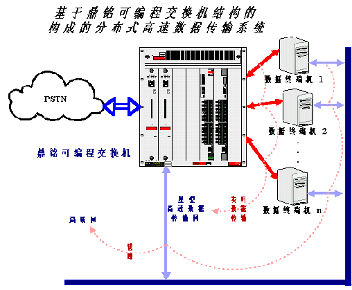 鼎銘高速數(shù)據(jù)傳輸板置于其可編程交換機(jī)內(nèi),外部可以和多臺(tái)PC或工控機(jī)相連,因?yàn)榭删幊探粨Q機(jī)可以級(jí)聯(lián),所以可以和外部連接的PC或工控機(jī)理論上沒有特別限制。這樣可編程交換機(jī)的內(nèi)部I/O總線(類比于PC機(jī)的PCI或ISA總線)就不再傳輸實(shí)時(shí)數(shù)據(jù)(如語音數(shù)據(jù)),而只負(fù)責(zé)非實(shí)時(shí)性的管理和信令數(shù)據(jù),語音或其它實(shí)時(shí)數(shù)據(jù)從外部PC直接傳入可編程交換機(jī)的高速數(shù)據(jù)傳輸板,然后通過交換直接進(jìn)入外部公共電信網(wǎng)(PSTN)。