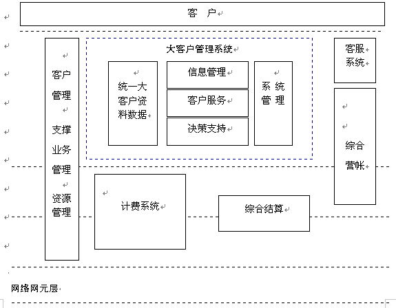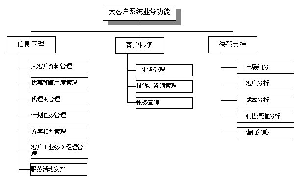 電信大客戶管理系統(tǒng)是在收集大客戶市場調(diào)查信息、大客戶資料信息、大客戶經(jīng)營戰(zhàn)略資源的基礎(chǔ)上,自動采集專業(yè)計費(fèi)、綜合營帳、客服、網(wǎng)管、財務(wù)等系統(tǒng)的相關(guān)數(shù)據(jù),實(shí)現(xiàn)快速、全面、準(zhǔn)確的新客戶業(yè)務(wù)受理、新增需求受理及故障處理過程通道,實(shí)現(xiàn)完善的客戶經(jīng)理管理、代理商管理系統(tǒng),最終實(shí)現(xiàn)完整的大客戶滿意度評估體系和針對大客戶的個性化服務(wù)。建成后的系統(tǒng)從管理、服務(wù)、分析三方面出發(fā)主要應(yīng)具備信息管理、客戶服務(wù)、決策支持功能。