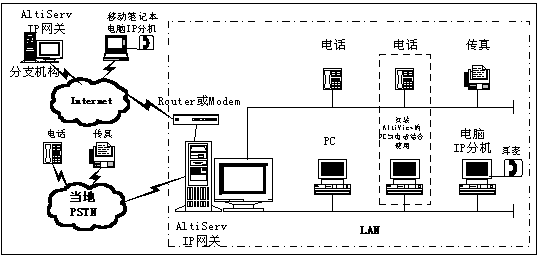 AltiServ系統(tǒng)通過IP組合成一個網(wǎng)絡。同時,該功能允許用戶通過IP外線撥打一個遠端的AltiServ系統(tǒng)