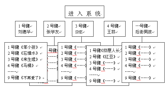 眾所周知,目前大多數(shù)電話機(jī)和手機(jī)的操作鍵盤都只有0-9十個(gè)數(shù)字鍵和*號和#號兩個(gè)符號鍵,因此在設(shè)計(jì)導(dǎo)航菜單的時(shí)候很受限制。比如在點(diǎn)歌節(jié)目中,用這些數(shù)字鍵來指代上千首歌曲是根本不可能的。以前多采用的方法有兩種:一是預(yù)先給用戶發(fā)送歌曲手冊,上面可以查到每首歌曲的代號。這種方式的缺點(diǎn)是實(shí)時(shí)性差,不能隨時(shí)更新歌曲庫。另外印刷宣傳資料帶來的人力和成本也不容忽視;另一種方法是將歌曲根據(jù)歌手、主題進(jìn)行分類,比如下圖所列的結(jié)構(gòu):