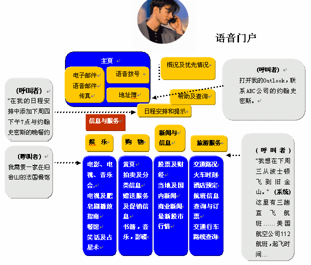 基于在語音識別技術(shù)準(zhǔn)確度上已有突破性的進(jìn)展,因此可以利用語音,不僅僅是改變原有的鍵盤輸入查詢方式,而且能夠使自動(dòng)應(yīng)答系統(tǒng)處理更加復(fù)雜的情況。用戶撥打服務(wù)電話的時(shí)候,只需說出他/她的需求即可。如在電子黃頁業(yè)務(wù)中,用戶要查詢關(guān)于A公司的情況,服務(wù)電話接通以后就可以直接說出"A公司",而不要按鍵通過一層層的菜單目錄,然后系統(tǒng)就能自動(dòng)播報(bào)出該單位介紹信息和聯(lián)系方式等。
