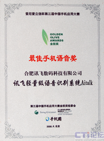 2008年6月26日,代表了中國手機應(yīng)用最高水平、最新發(fā)展的索尼愛立信杯第三屆中國手機應(yīng)用大賽金枝獎頒獎典禮在北京隆重舉行,科大訊飛全資子公司——訊飛數(shù)碼提交的參賽產(chǎn)品,輕量級語音識別系統(tǒng)Aitalk,榮獲本屆大賽 “最佳手機語音金枝獎”。這是科大訊飛既在本賽事首屆、第二屆獲此殊榮后,連續(xù)第三年奪得該獎項,充分體現(xiàn)了科大訊飛在手機語音應(yīng)用領(lǐng)域具備的超群實力和絕對的領(lǐng)先地位。
