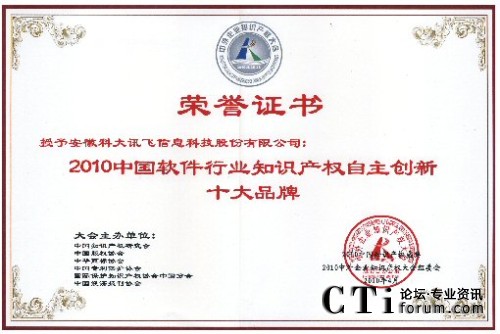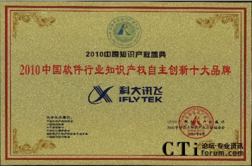 CTI論壇(ctiforum)4月29日消息(記者 潘婷婷):2010年4月25日,由中國知識產(chǎn)權(quán)研究會、中國專利保護協(xié)會、中國版權(quán)協(xié)會等單位聯(lián)合舉辦的“2010中外企業(yè)知識產(chǎn)權(quán)大會”在人民大會堂隆重舉行。在當日的“2010中國知識產(chǎn)權(quán)盛典頒獎典禮”中,科大訊飛憑借強大的自主創(chuàng)新能力以及在知識產(chǎn)權(quán)創(chuàng)造、保護與應用方面的突出表現(xiàn)獲評“2010年中國軟件行業(yè)知識產(chǎn)權(quán)自主創(chuàng)新十大品牌”。
