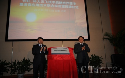 CTI論壇(ctiforum)12月14消息(記者 潘婷婷): 12月12日,科大訊飛與長虹集團(tuán)戰(zhàn)略合作簽約暨共建聯(lián)合實驗室揭牌儀式在科大訊飛語音產(chǎn)業(yè)基地研發(fā)大樓隆重舉行。根據(jù)合作框架協(xié)議,雙方將在戰(zhàn)略聯(lián)盟的基礎(chǔ)上,以共建聯(lián)合實驗室為主要載體,旨在依托各自行業(yè)領(lǐng)域的長期積淀優(yōu)勢、強(qiáng)強(qiáng)聯(lián)合,達(dá)成戰(zhàn)略互信,加強(qiáng)緊密合作,積極推動“語音核心引擎+智能終端平臺” 的特色應(yīng)用模式,深入拓展智能語音科技在智能電視等終端產(chǎn)品市場的應(yīng)用范圍,合力開創(chuàng)智能語音終端創(chuàng)新應(yīng)用市場空間。