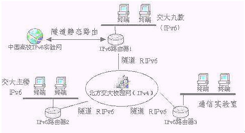 FH6501(IPv6路由器)已經(jīng)在北方交通大學(xué)學(xué)生IPv6實驗床實際安全運行了六個月。北方交通大學(xué)學(xué)生IPv6實驗床采用我公司IPv6路由器產(chǎn)品,架構(gòu)了三個主節(jié)點,借助隧道連接到由Nokia資助建設(shè)的中國高校IPv6實驗床。目前三個主節(jié)點之間的連接是借助于學(xué)校原有的IPv4網(wǎng)絡(luò),通過隧道技術(shù)實現(xiàn)節(jié)點間的通信(見圖示)。