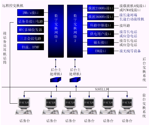 "前臺(tái)座席系統(tǒng)"包括班長(zhǎng)臺(tái)和話務(wù)臺(tái),均采用微機(jī),運(yùn)用先進(jìn)的計(jì)算機(jī)聯(lián)網(wǎng)技術(shù),將它們通過(guò)網(wǎng)絡(luò)與"后臺(tái)交換系統(tǒng)"相連。班長(zhǎng)臺(tái)和所有話務(wù)臺(tái)的硬件連接完全相同,任何一臺(tái)損壞,不影響其它話務(wù)臺(tái)的使用,即不存在關(guān)鍵接點(diǎn),提高了系統(tǒng)的安全可靠性。全漢化圖形界面,交互式人機(jī)操作方式,簡(jiǎn)單明了,易于掌握。所有話務(wù)臺(tái)均為集記錄、查號(hào)、市話轉(zhuǎn)接、長(zhǎng)話轉(zhuǎn)接為一體的綜合型人工話務(wù)臺(tái),所有功能由數(shù)據(jù)定義,可分可合,可方便的進(jìn)行設(shè)置,也可臨時(shí)并席,為系統(tǒng)高質(zhì)量的服務(wù)提供了可靠的基礎(chǔ)。所有話票均在計(jì)算機(jī)上填寫,由網(wǎng)絡(luò)自動(dòng)傳送,不再使用紙?jiān)捚保膊恍枞斯し职l(fā)話票,極大的減輕了勞動(dòng)強(qiáng)度,提高了辦事效率。為了減小系統(tǒng)規(guī)模,我們將查詢、計(jì)費(fèi)、統(tǒng)計(jì)、管理、維護(hù)五種功能融合為一體,統(tǒng)一成為多功能的班長(zhǎng)臺(tái),其功能亦可分可合,視用戶需求而定。