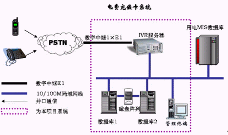 電力繳費卡系統(tǒng)系統(tǒng)由自動語音流程服務器IVR、系統(tǒng)管理終端和數(shù)據(jù)庫三部分組成。如下圖所示: