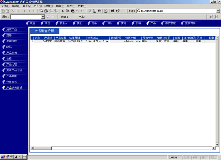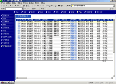 管理人員可能需要對比產(chǎn)品銷售計劃與實際銷售的產(chǎn)品數(shù)量的關(guān)系,也有可能要對比某款產(chǎn)品與競爭產(chǎn)品銷售的情況,這時候可以利用產(chǎn)品銷售統(tǒng)計功能。它最大的好處是各項目數(shù)據(jù)普遍關(guān)聯(lián),允許任意組合查詢條件(見圖4,點擊下圖,可彈出更清晰的大圖)