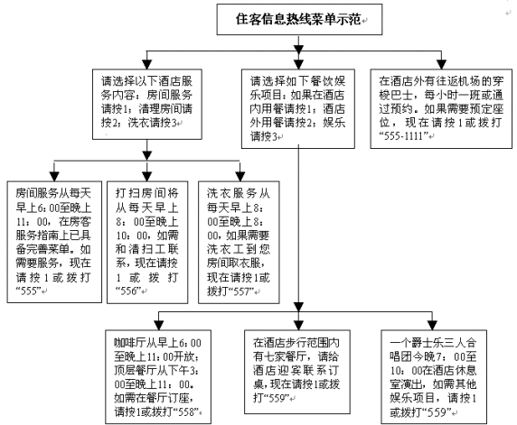 另一個提高服務(wù)質(zhì)量并可減少工作消耗的方式是讓住客直接從電話中獲取主要信息,特別是那些簡單、重復(fù)、繁瑣的問題,從而使服務(wù)人員有更多的時間從事其他工作。