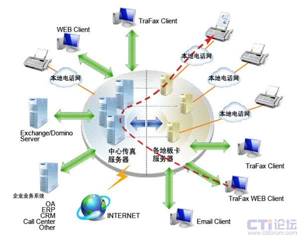 應(yīng)用TraFax Enterprise Server拓敏傳真服務(wù)器系統(tǒng)企業(yè)版所部署的中心傳真服務(wù)器同時支持本地、異地多板卡服務(wù)器接入,從而使集團(tuán)企業(yè)的傳真資源能夠?qū)崿F(xiàn)真正高效、安全的集中管理,員工可以從他們的電腦桌面直接收發(fā)、瀏覽、編輯、轉(zhuǎn)發(fā)以及查找傳真文件。服務(wù)器接收的傳真自動分發(fā)給正確的接收人,支持語音提示、能夠與當(dāng)前幾乎所有主流應(yīng)用系統(tǒng)進(jìn)行無縫集成,支持雙機(jī)熱備份,具有高度的系統(tǒng)可靠性。
