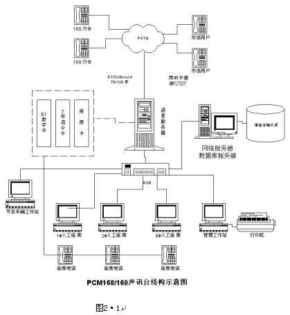 系統(tǒng)主要由計算機網(wǎng)絡、數(shù)字中繼接口、人工座席、語音處理及存儲、系統(tǒng)管理(數(shù)據(jù)庫管理+計費管理+語音編輯)幾部分組成。如圖2·1所示: