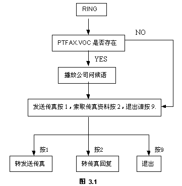 其中PTFAX.VOC存在當(dāng)前工作路徑,如果存在,則播放公司問候語,接著播放下一句語音提示;如果該文件不存在,則系統(tǒng)直接播放VFGT.VOC的內(nèi)容,用戶可根據(jù)實際需求而定。