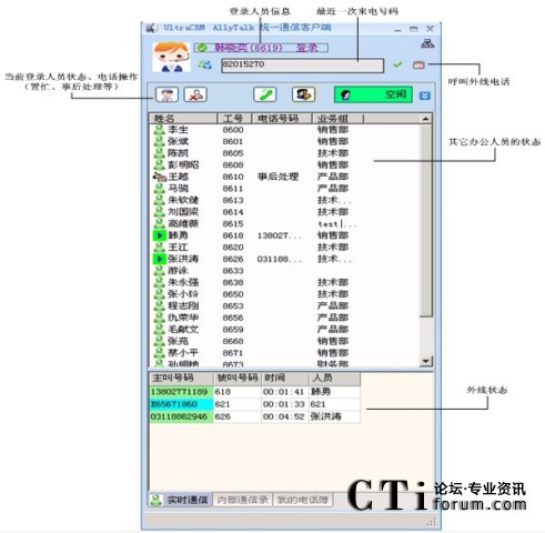 辦公人員可以通過時實(shí)電話的界面:實(shí)時監(jiān)控系統(tǒng)的呼叫隊(duì)列、其它辦公人員的工作狀態(tài);并且通過屏幕控制電話的接答、掛機(jī)、轉(zhuǎn)接,以及建立會議等操作。如下圖所示: