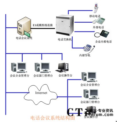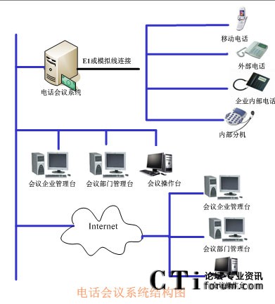 TalenTel CNF電話會議系統(tǒng)可以與程控交換機配合使用,也可以直接與局方的系統(tǒng)進行連接,系統(tǒng)的構成含如下幾部分:TalenTel CNF電話會議系統(tǒng)服務器(ctsIVR)、會議企業(yè)管理員模塊、會議部門管理員模塊、會議操作員管理模塊、數(shù)據庫等組成。