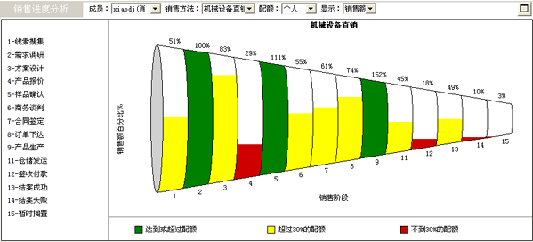 圓錐體上方每個(gè)階段都對(duì)應(yīng)一個(gè)百分比數(shù)值,表示當(dāng)前各個(gè)銷(xiāo)售階段的銷(xiāo)售額與該階段任務(wù)指標(biāo)的比率。例如假設(shè)"線(xiàn)索搜集"階段的任務(wù)指標(biāo)是100,000元,當(dāng)前的比率是51%,則表示當(dāng)前處于"線(xiàn)索收集"階段的機(jī)會(huì)的銷(xiāo)售額之和是51,000元。如果銷(xiāo)售額/任務(wù)指標(biāo)的值小于30%,則以紅色塊表示;如果值介于30%~100%則以黃色塊表示,如果值大于或等于100%,則以綠色塊表示。