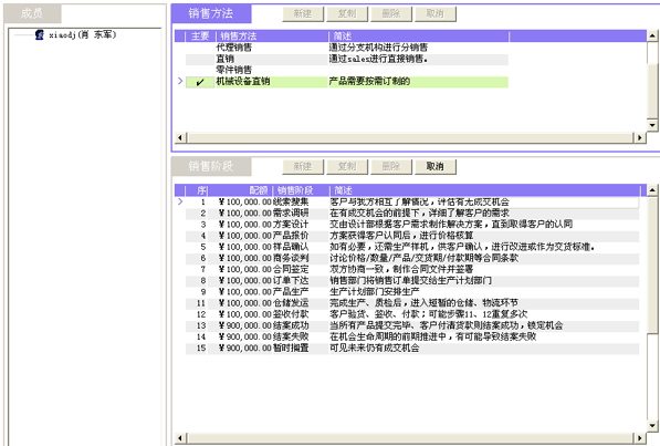 一套好的CRM軟件,應(yīng)當(dāng)同時(shí)支持多種銷(xiāo)售方法。例如,精密機(jī)械制造行業(yè),有可能同時(shí)需要支持四種銷(xiāo)售方法:標(biāo)準(zhǔn)整機(jī)銷(xiāo)售方法、項(xiàng)目型整機(jī)銷(xiāo)售方法、零件及有償服務(wù)銷(xiāo)售方法、三包件等。每個(gè)銷(xiāo)售方法都有對(duì)應(yīng)的銷(xiāo)售流程。以圖2為例,我們看到"機(jī)械設(shè)備直銷(xiāo)"的銷(xiāo)售方法,對(duì)應(yīng)著15個(gè)銷(xiāo)售階段,每個(gè)階段都可通過(guò)簡(jiǎn)述來(lái)明確該階段典型的業(yè)務(wù)特征、成交可能性的區(qū)間,以便銷(xiāo)售代表在操作記錄的時(shí)候擁有共識(shí)。