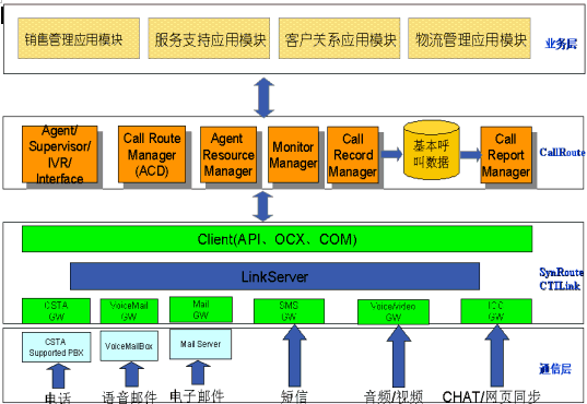 。。CallRoute平臺是一個基于CSTA標(biāo)準(zhǔn)、支持分布互連的呼叫中心平臺。商路通呼叫中心平臺全套產(chǎn)品包括多個服務(wù)部件,客戶端的接口部件(OCX、DLL)以及功能豐富應(yīng)用工具。我們的軟件系統(tǒng)采用先進的軟件工程設(shè)計方法,整個系統(tǒng)的軟件結(jié)構(gòu)體系遵循以下設(shè)計原則: